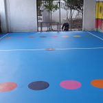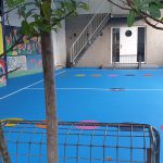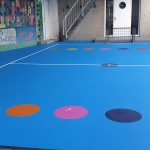 Met onze Topcourts coating Acrylcoat sport zijn eerst alle gaten en scheuren gerepareerd en vervolgens is het hele vlak voorzien van 2 lagen Acrylcoat sport in de kleur blauw. Op de coating zijn witte voetbalbelijning en gekleurde stippen aangebracht met een snel drogende Kaltplastik.